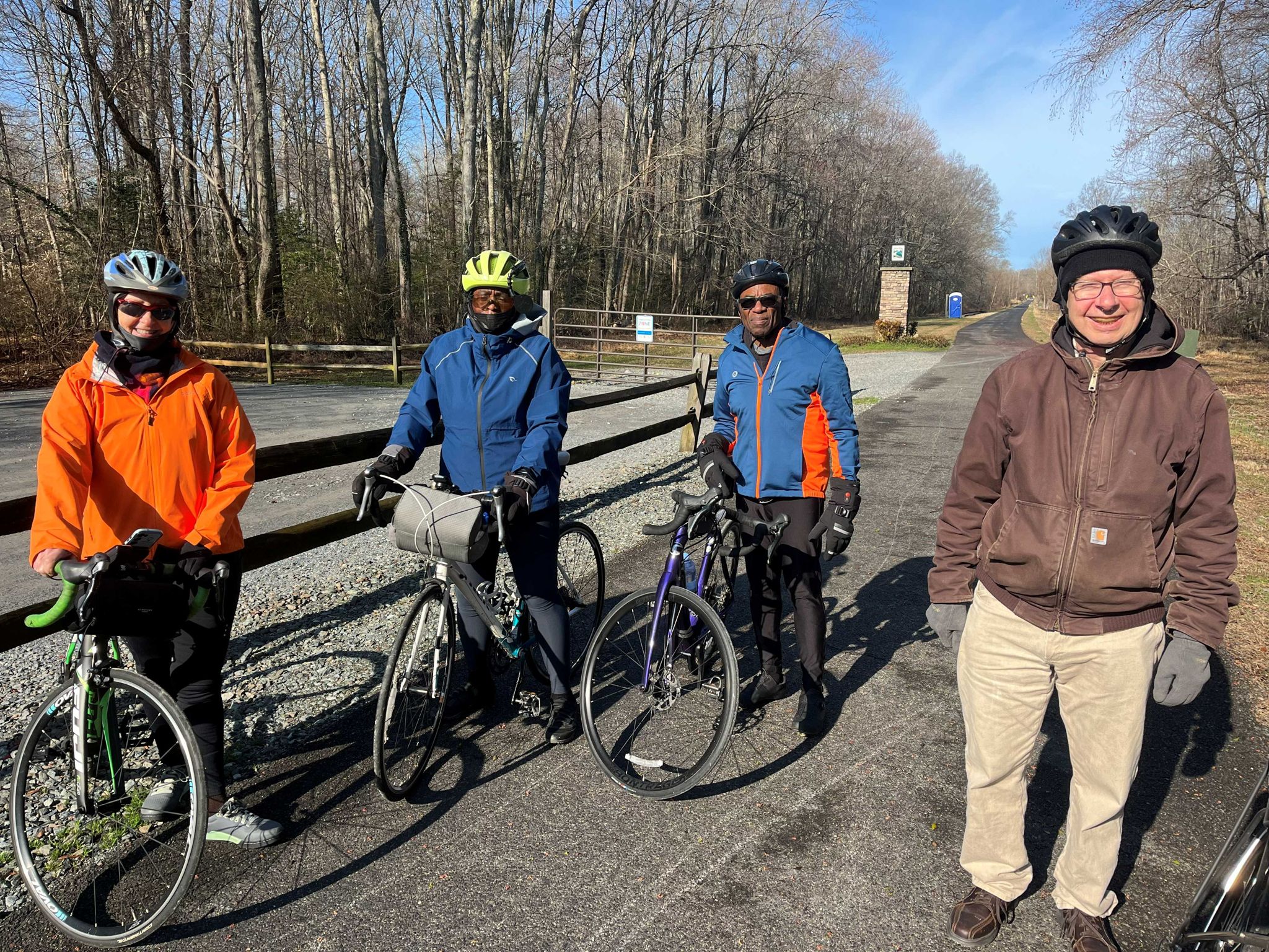 We explored two spur trails near the new bridge: one was to the Patuxent River where the original rail line went over a now-missing bridge, and the other spur took us to the power lines west of the new bridge and abruptly stopped. There we found a rider with a flat tire and loaned her a pump so she could limp back to her car with her slow leak. There are at least 3 self-serve bike repair stations with pumps along the trail, but none where she was.