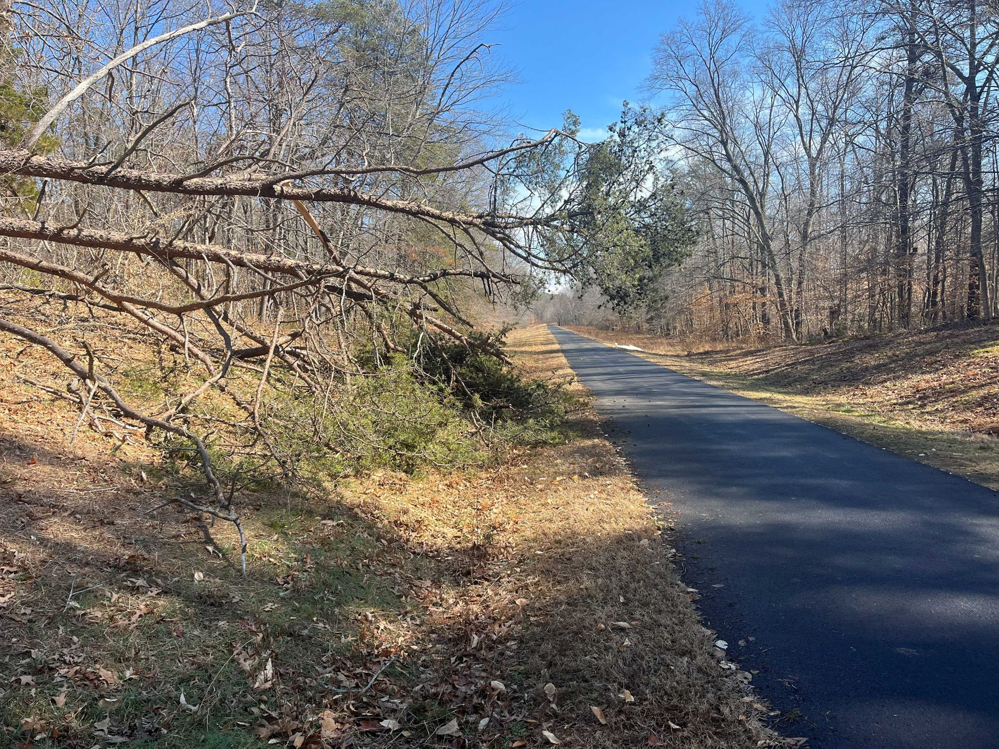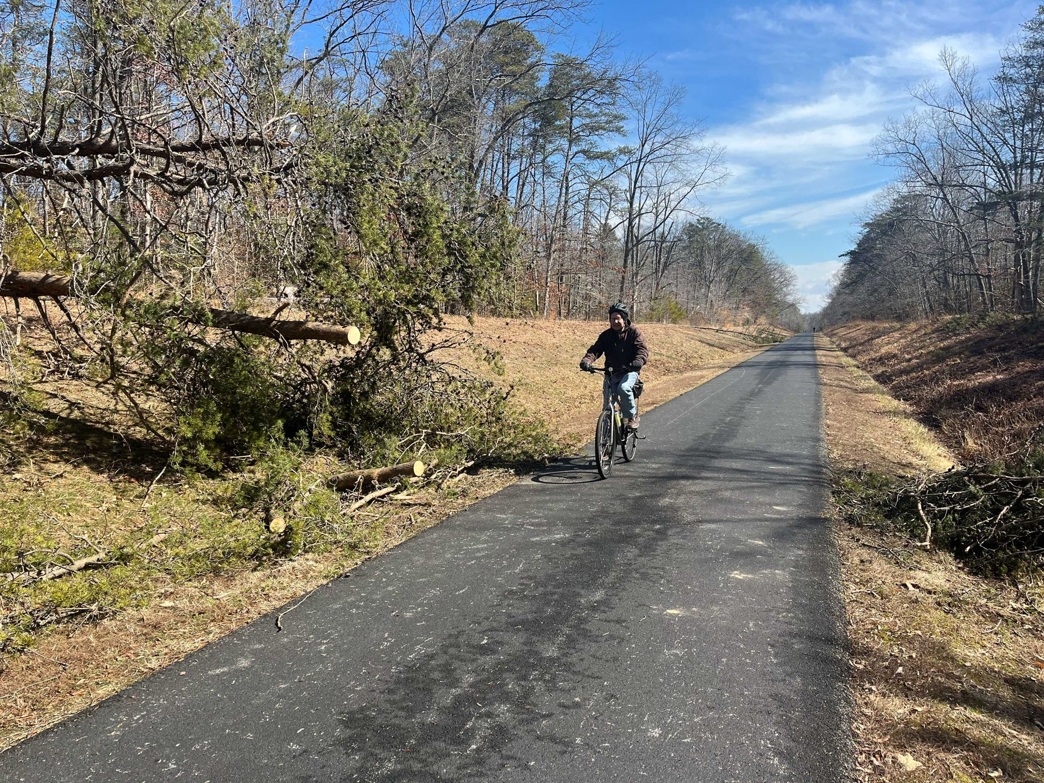 The full length of the trail is 13 miles thanks to a new bridge over the Patuxent River connecting two existing shorter segments into one. This was once a railway line, nice and straight, except now there’s a dogleg near the middle to go over the new bridge. The trail is all nicely paved, about 10 feet wide, and passes through forest, along marshes and power lines, runs past peoples’ backyards, goes over rivers and mostly over and under roads (short tunnels). Elevation gains are gentle except for the hill north of the new bridge that switchbacks up a half a mile at an average 3.5% grade.